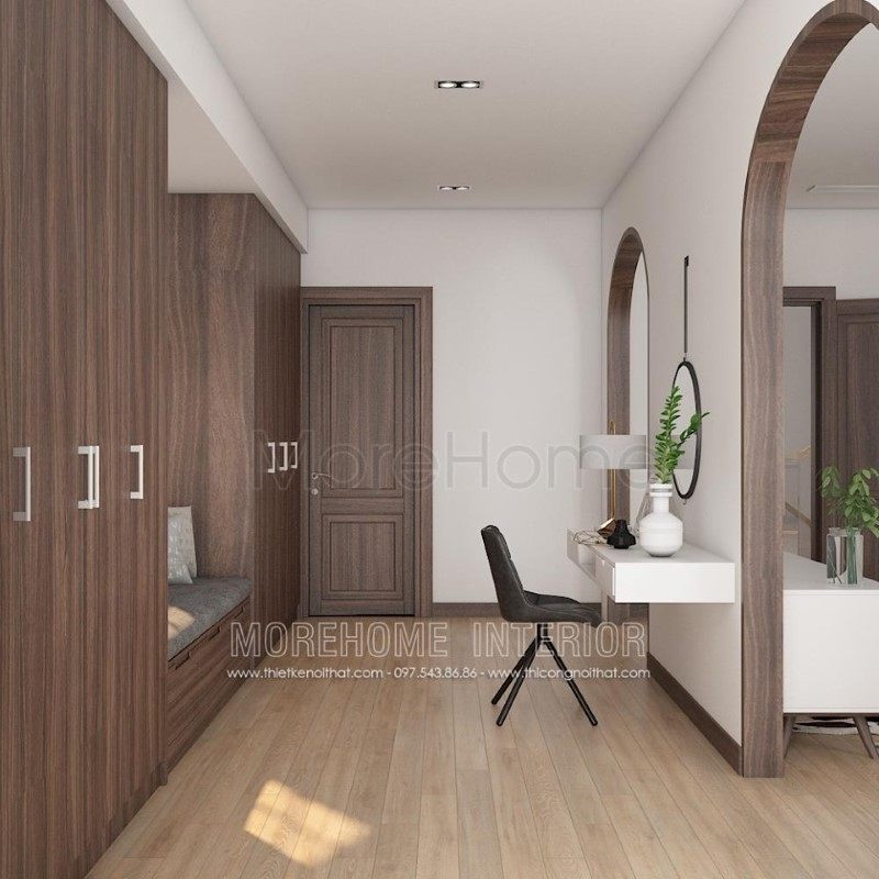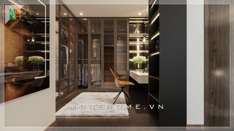 Một thiết kế nội thất hiện đại rất ấn tượng và độc đáo với cách bố trí tủ quần áo đối diện với không gian phòng tắm, bố trí 2 bên ở giữa là lối đi rất tiện nghi và hữu ích.