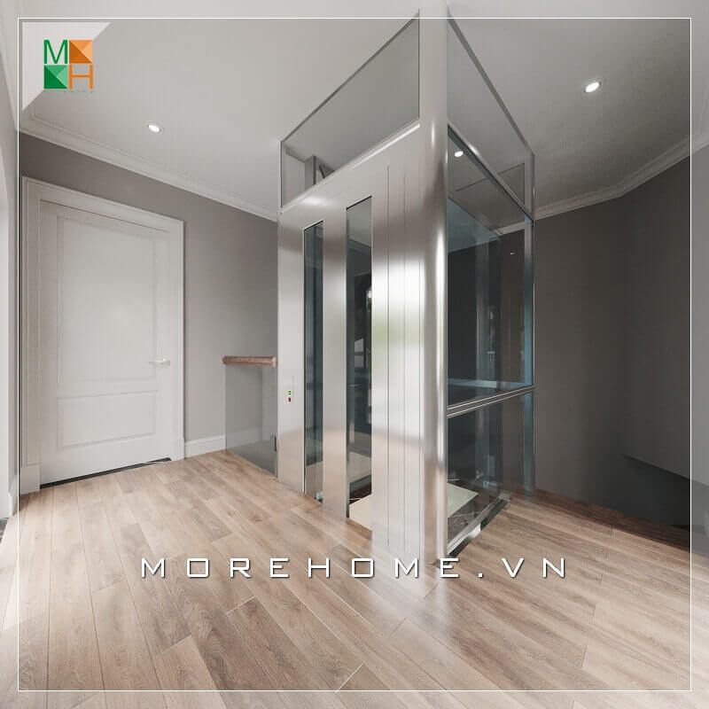 Với thiết kế thang máy kính cường lực trong suốt làm tăng thêm sự hiện đại, sang trọng cho căn biệt thự.