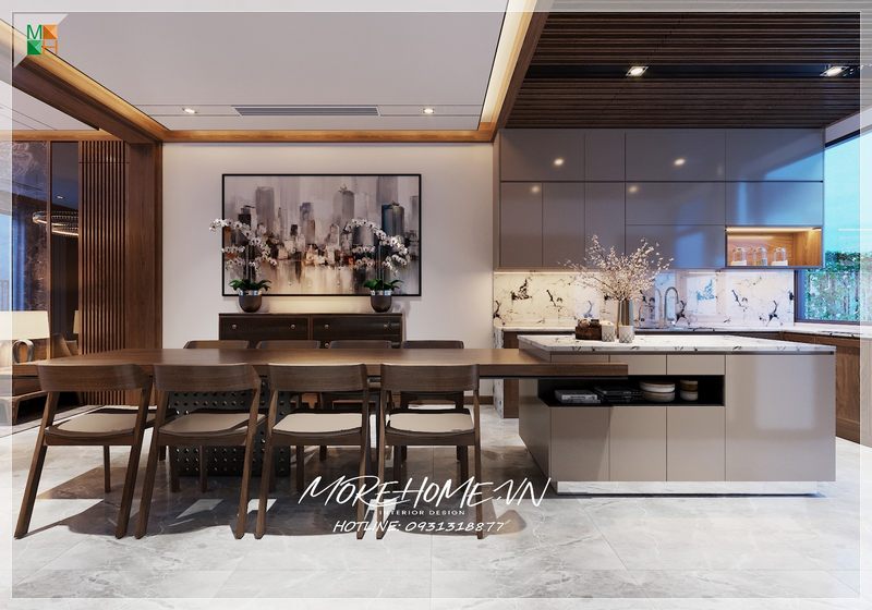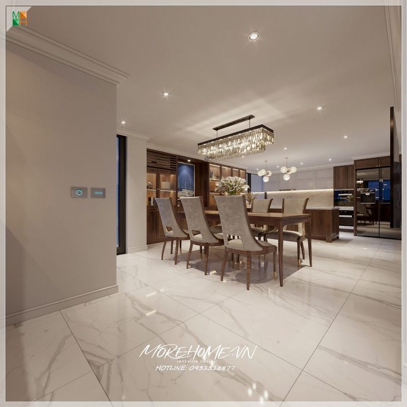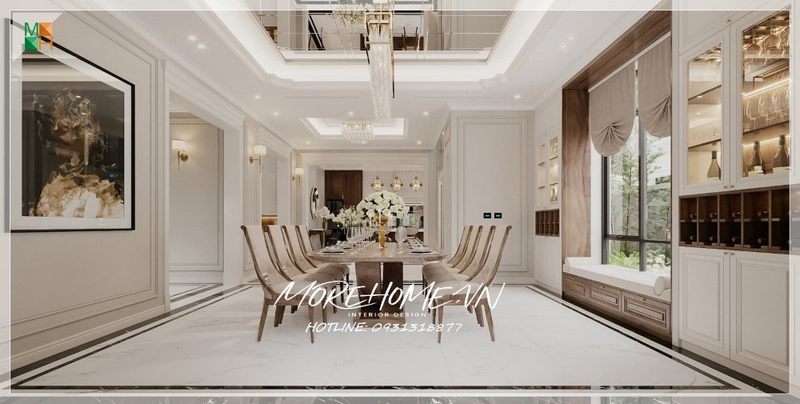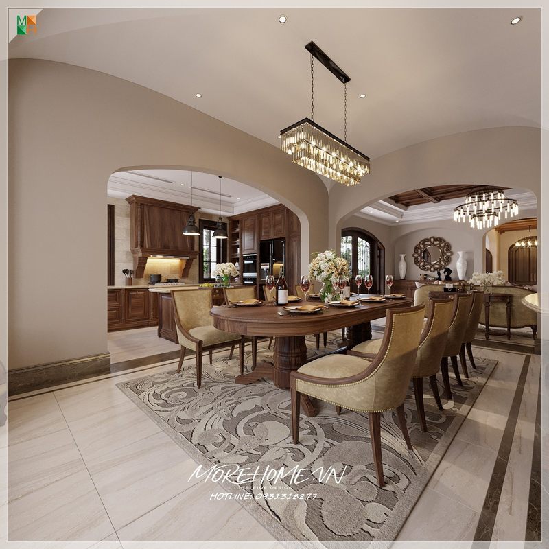 Mẫu thiết kế phòng ăn có phong cách tân cổ điển, bao gồm bộ bàn ăn 8 ghế gỗ óc chó tự nhiên, bọc nệm nỉ cao cấp và hệ thống đèn chùm kiểu dáng tinh tế.