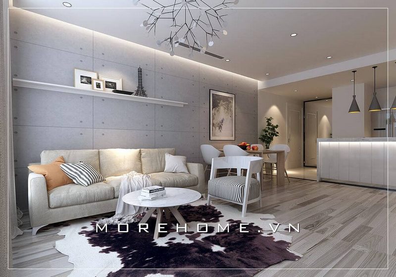 Vẻ đẹp lịch lãm, nhẹ nhàng của phòng khách căn hộ chung cư được tạo nên bởi bộ sofa bọc vải màu trắng xám tinh tế và khung gỗ óc chó nâu ấn tượng.