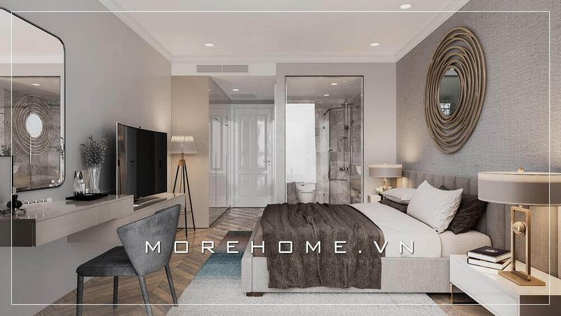 Nội thất phòng ngủ có phong cách hiện đại, được trang bị bằng những tông màu gợi cảm và sang trọng.
