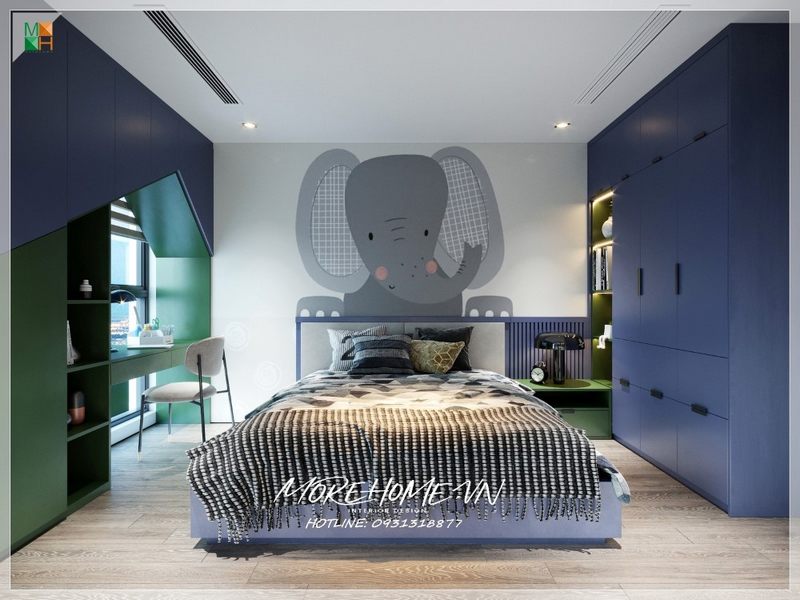 Mẫu tủ quần áo phòng ngủ con có thiết kế bằng gỗ công nghiệp màu xanh với nét động của nó.
