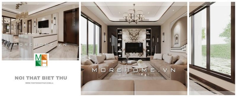 Phòng khách được trang bị hoàn hảo bằng những mẫu đồ nội thất tân cổ điển, chất liệu gỗ tự nhiên và da cao cấp.